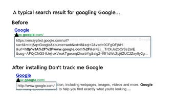 Don't Track Me Google är ett webbläsartillägg som kan passera Googles spårningsalgoritm som har förmågan att konvertera den direkta länken till en webbsida för att hämta söktermerna. Du kommer att märka spårningslänkar när du surfar på webben. Dessa är vanligtvis onödigt långa och används ofta av företag eller privatpersoner för att lokalisera klickets ursprung.